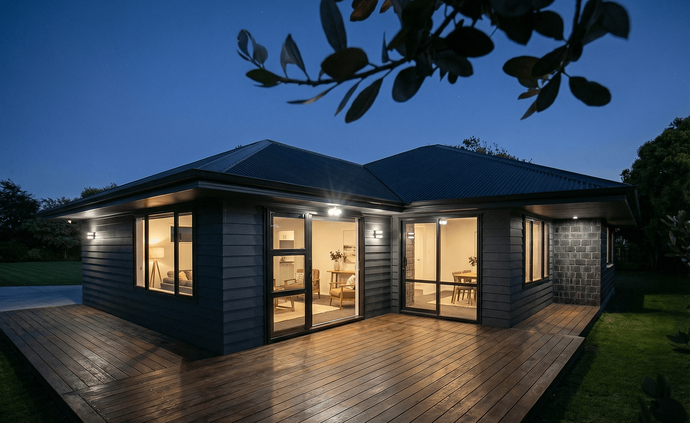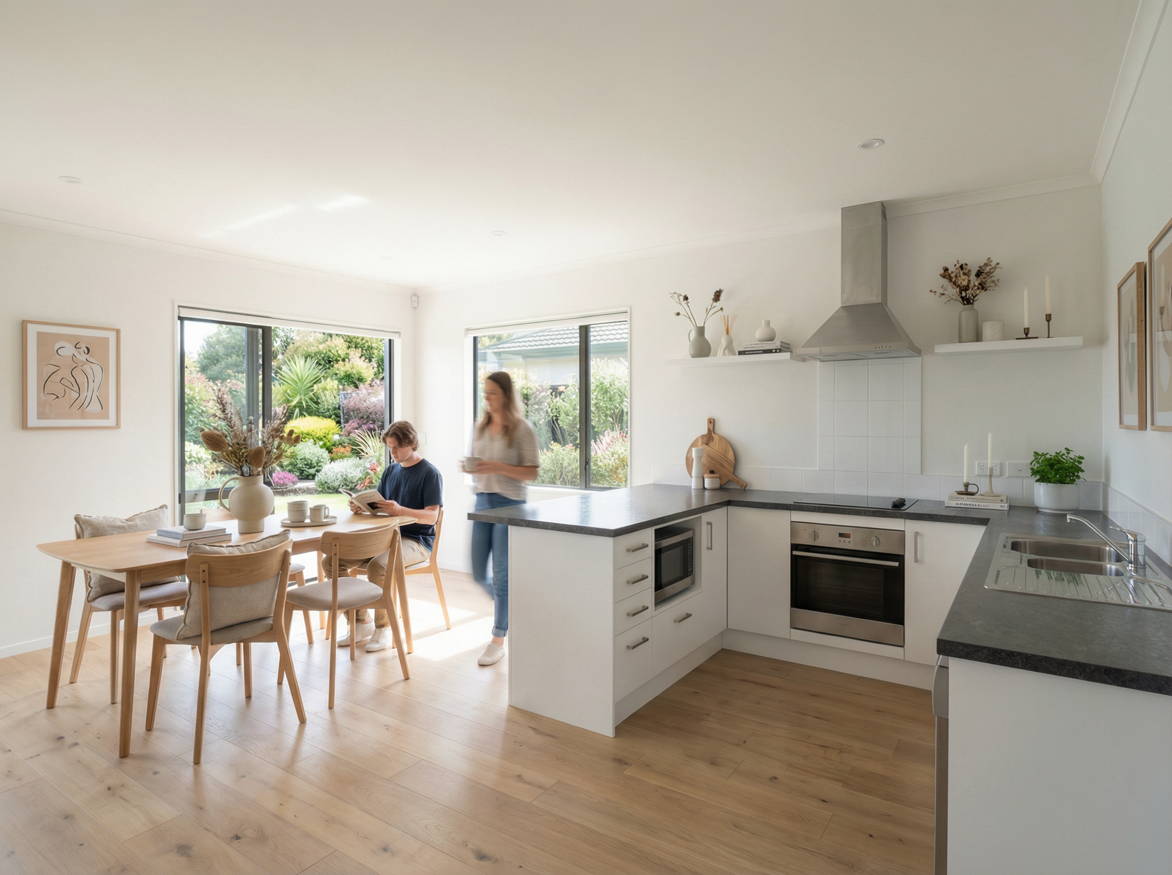 At the centre of The Trio home design series is the open plan kitchen/dining/living room. It’s designed cleverly designed to capture all day sun, and designate separate spaces whilst keeping sight lines open to maximise the feeling of spaciousness.