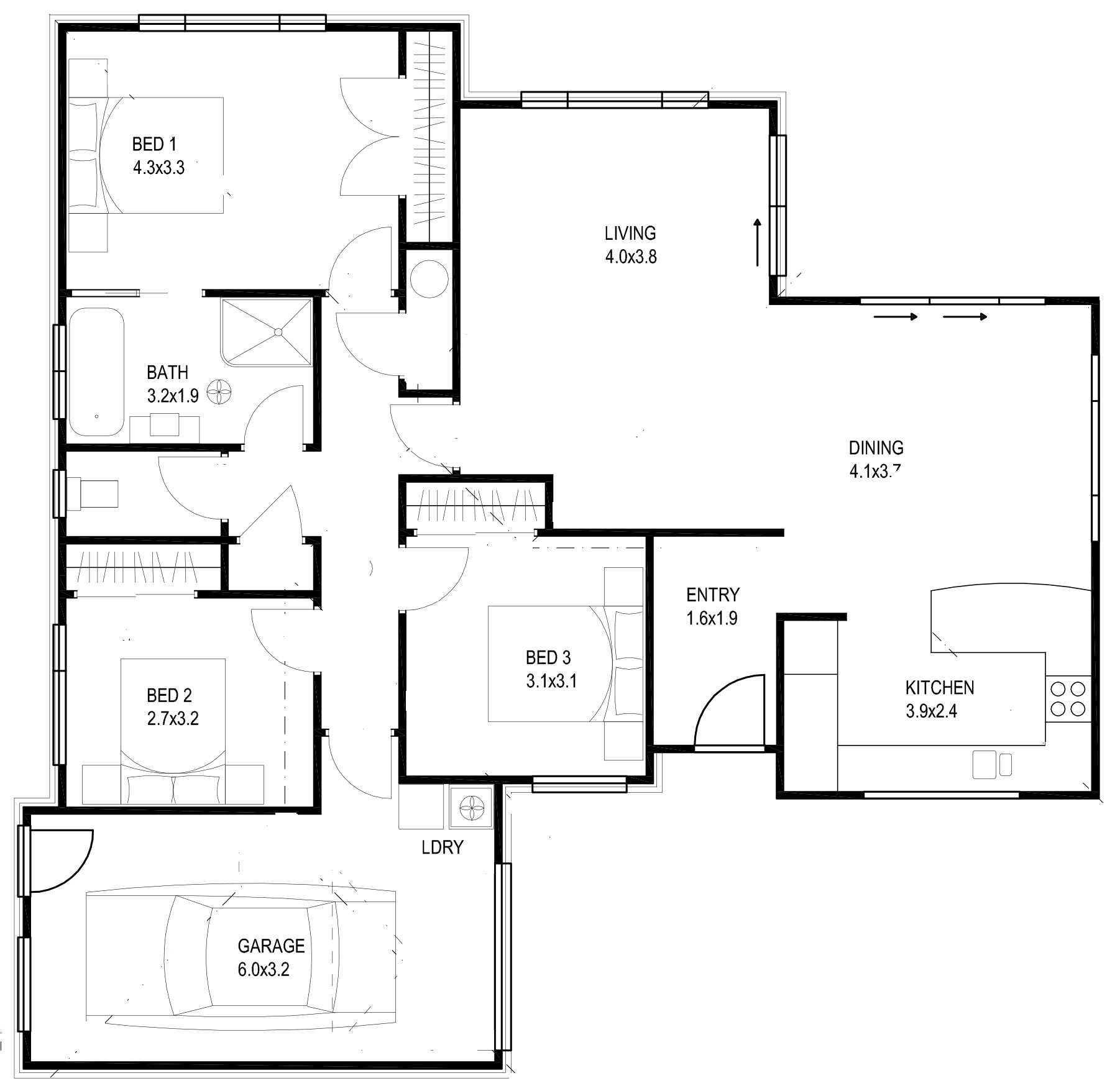 At the centre of The Trio home design series is the open plan kitchen/dining/living room. It’s designed cleverly designed to capture all day sun, and designate separate spaces whilst keeping sight lines open to maximise the feeling of spaciousness.