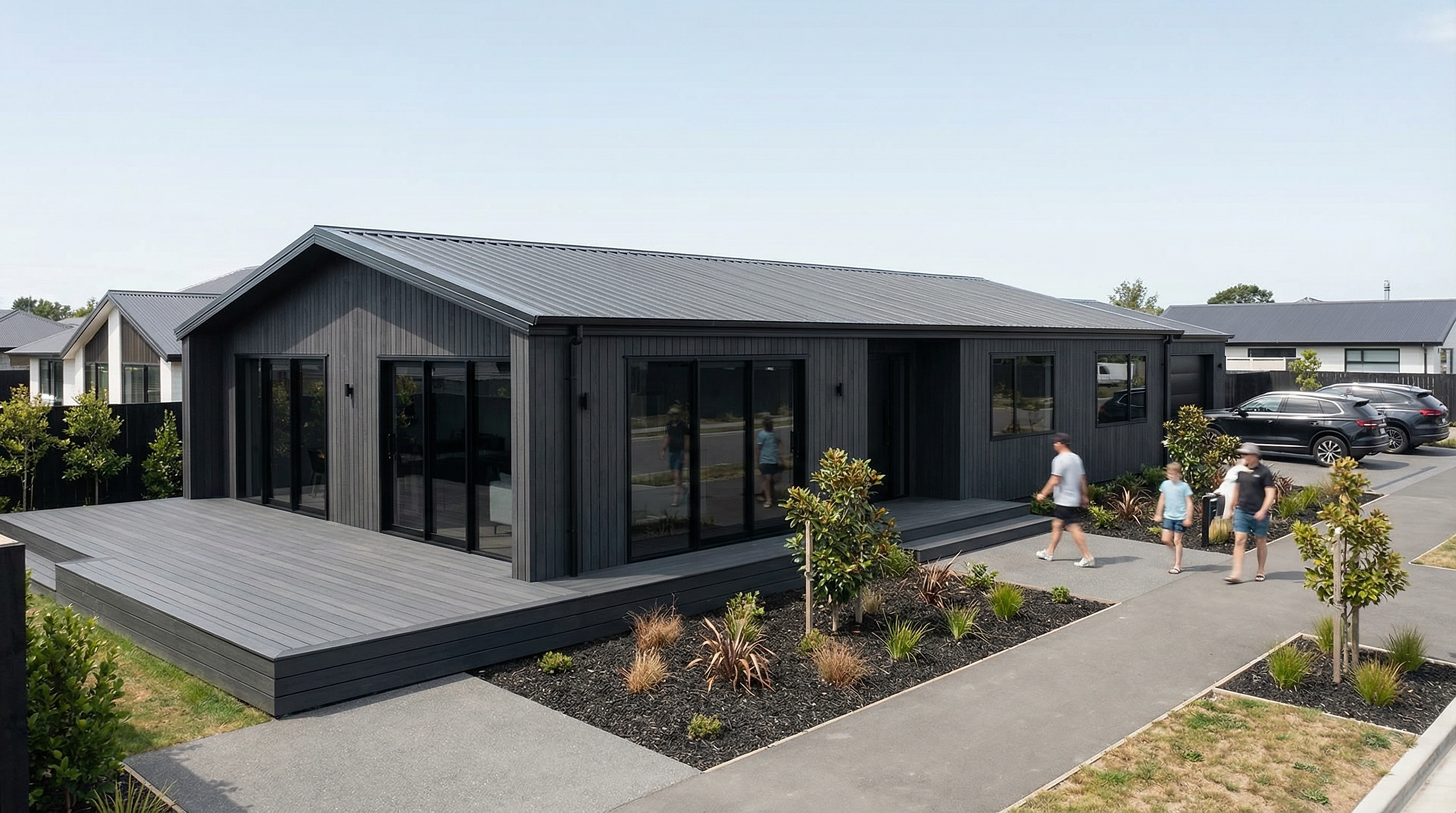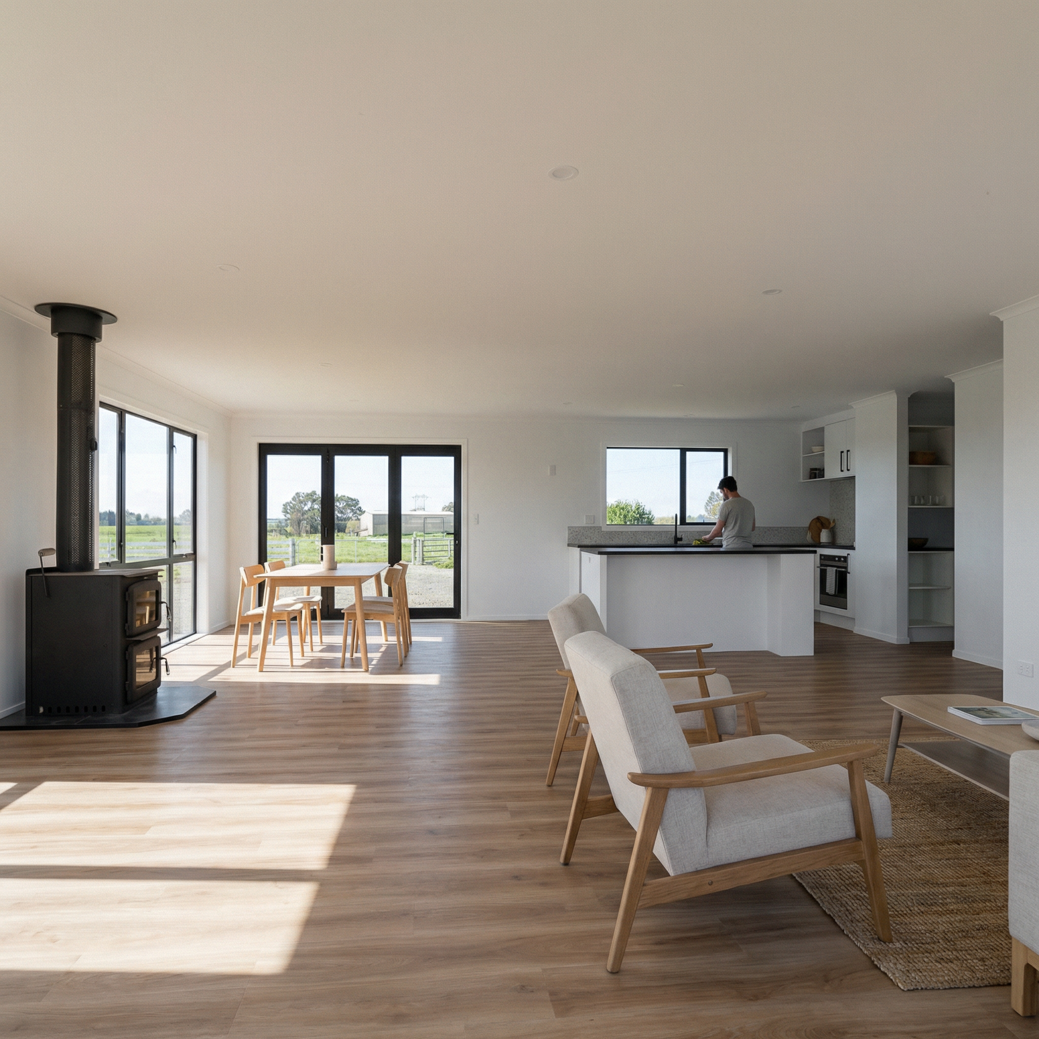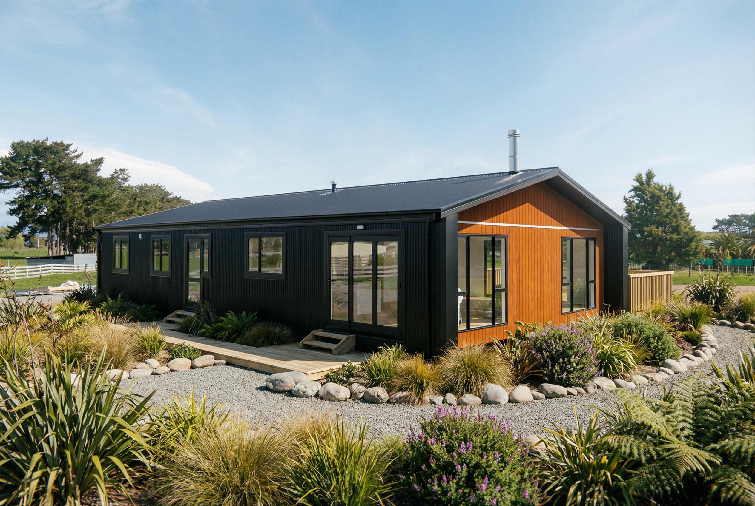 The best orientation for this house is on a north-south axis so the surprisingly spacious and light living areas get all day sun. Indoor/outdoor access in the morning and afternoon and at least one is sheltered from any wind at any time. The simple shape is also better for retaining heat.