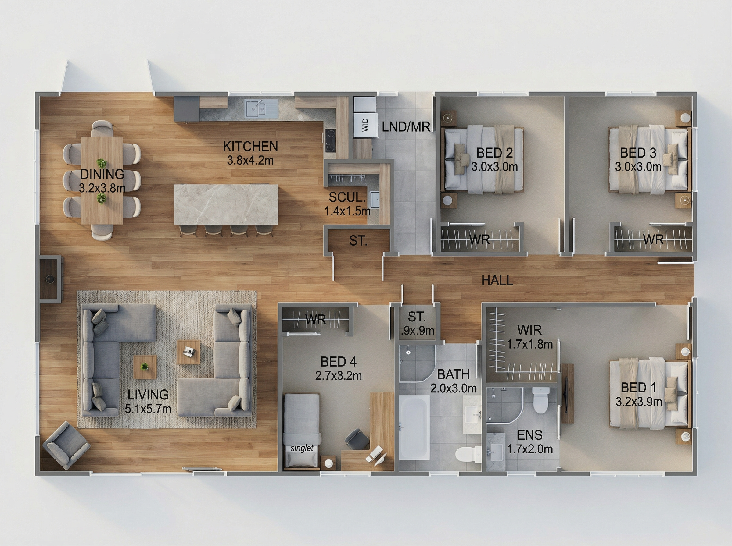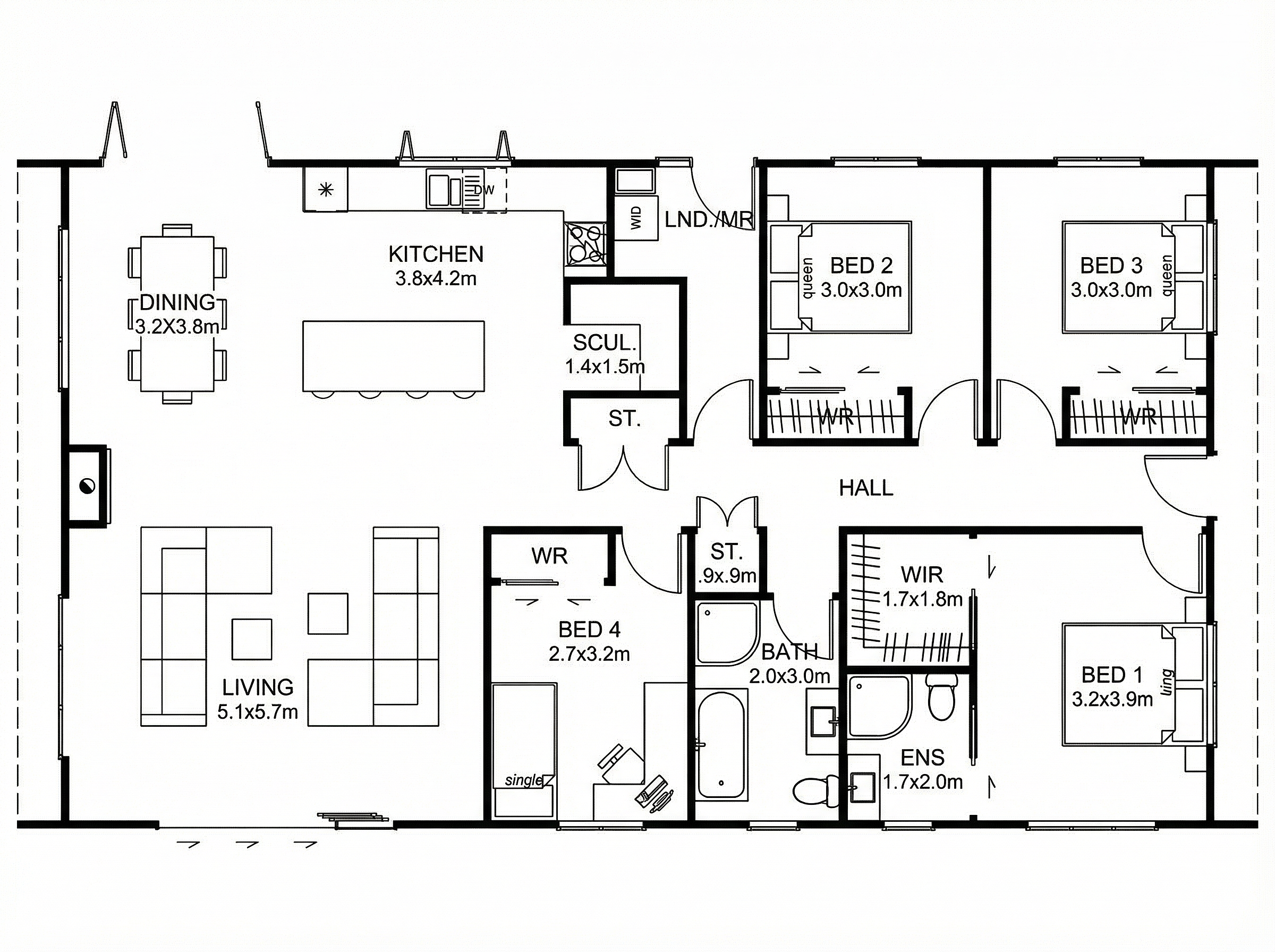This plan can easily be modified to include a double garage which would enlarge it to around 180m2.