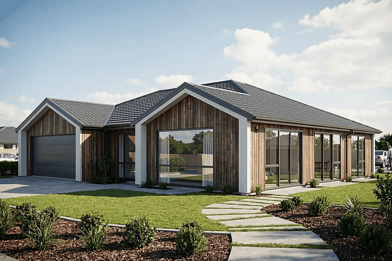 This fabulous homes’ simple shape makes it cost-effective, allowing for a focused spend on the architectural features that will make this home zing. The striking dark vertical cladding with cedar highlights is framed within thick buttress walls and towering gables, while the living areas and master bedroom feature floor to ceiling windows and doors. The picture window in the lounge gives The Lookout its name! The shape also allows for three double bedrooms, and a generous master with spacious ensuite and walk-in wardrobe.