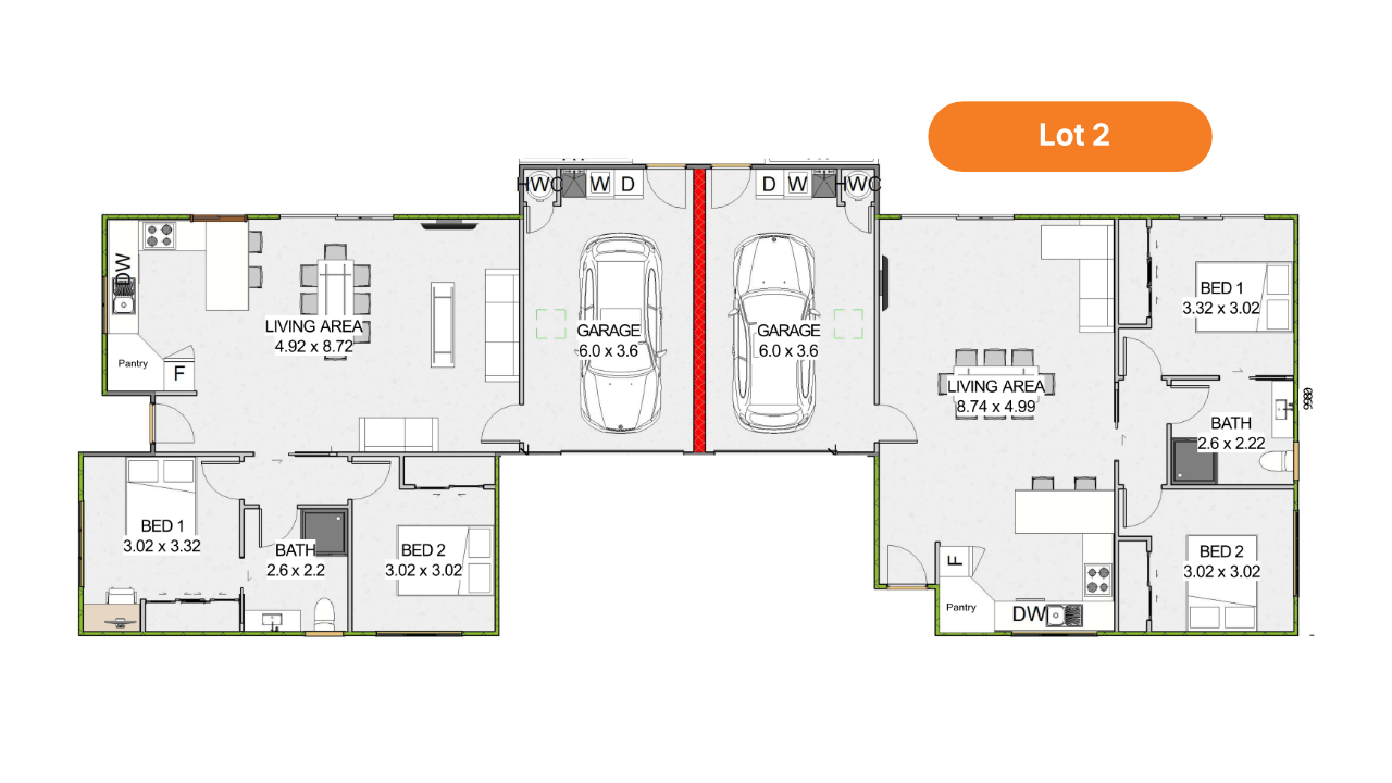 - Two bedrooms, and spacious open plan living. Minimal halls means the space is where you need it.
